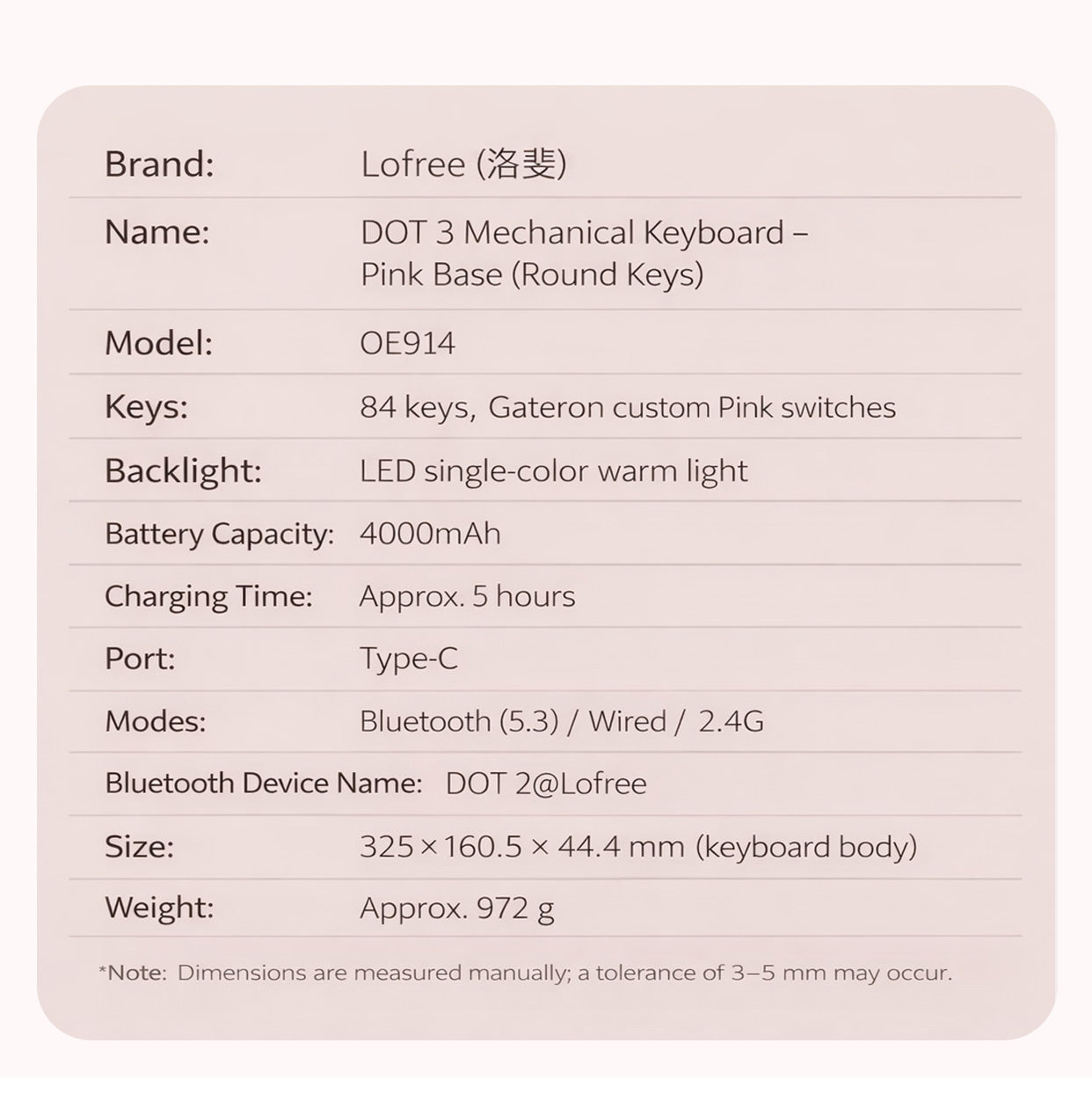 Note: Dimensions measured manually; 3–5 mm tolerance may occur.